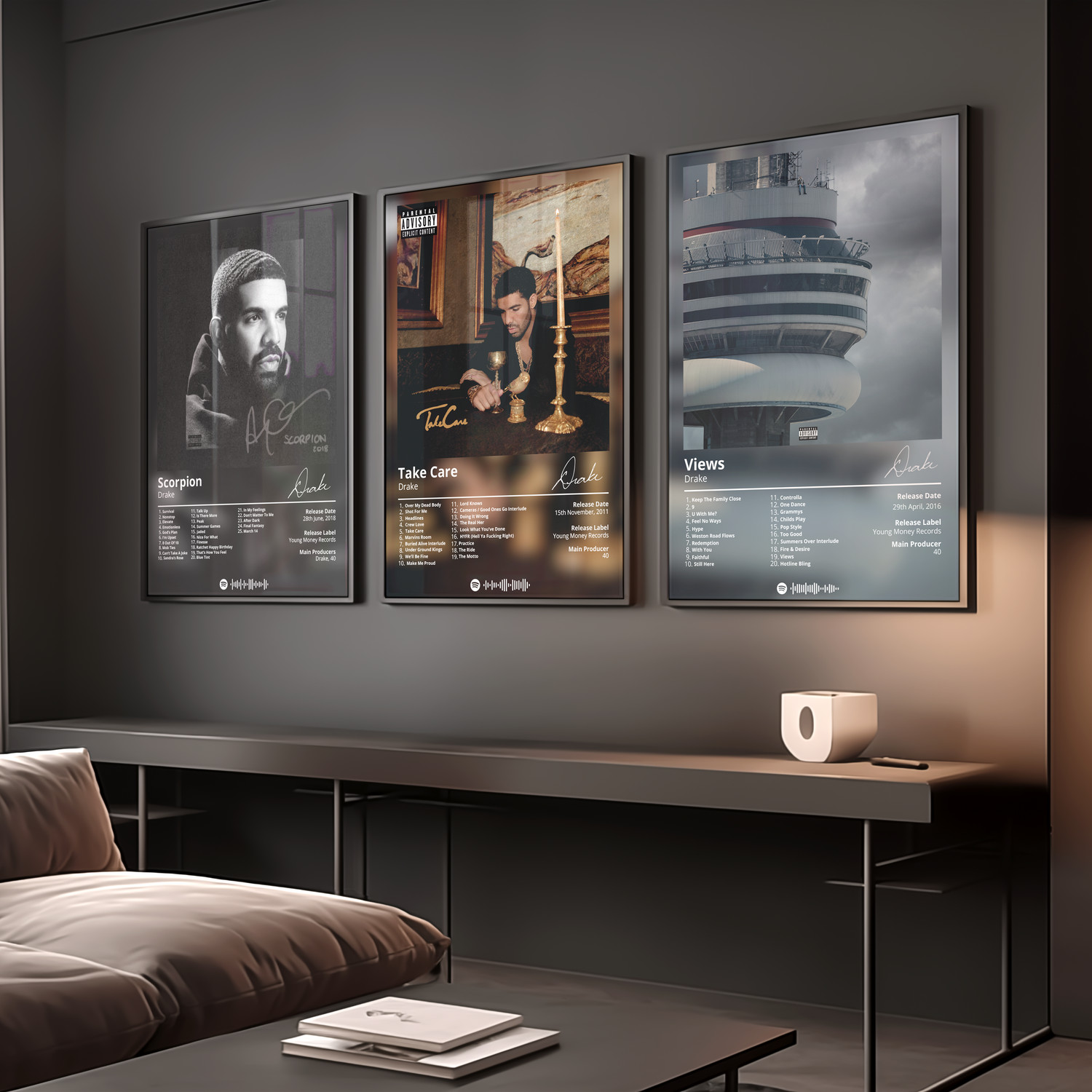 Transform your space into a shrine of hip-hop greatness with posters featuring iconic album covers from the one and only Drake. From the moody ambiance of "Take Care" to the bold statements of "Nothing Was the Same," each poster encapsulates the essence of Drake's music, inviting you to dive into his world of emotional depth and chart-topping hits.