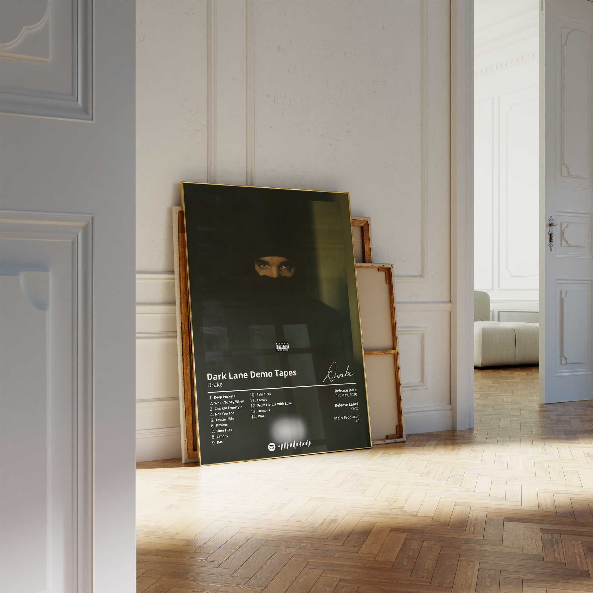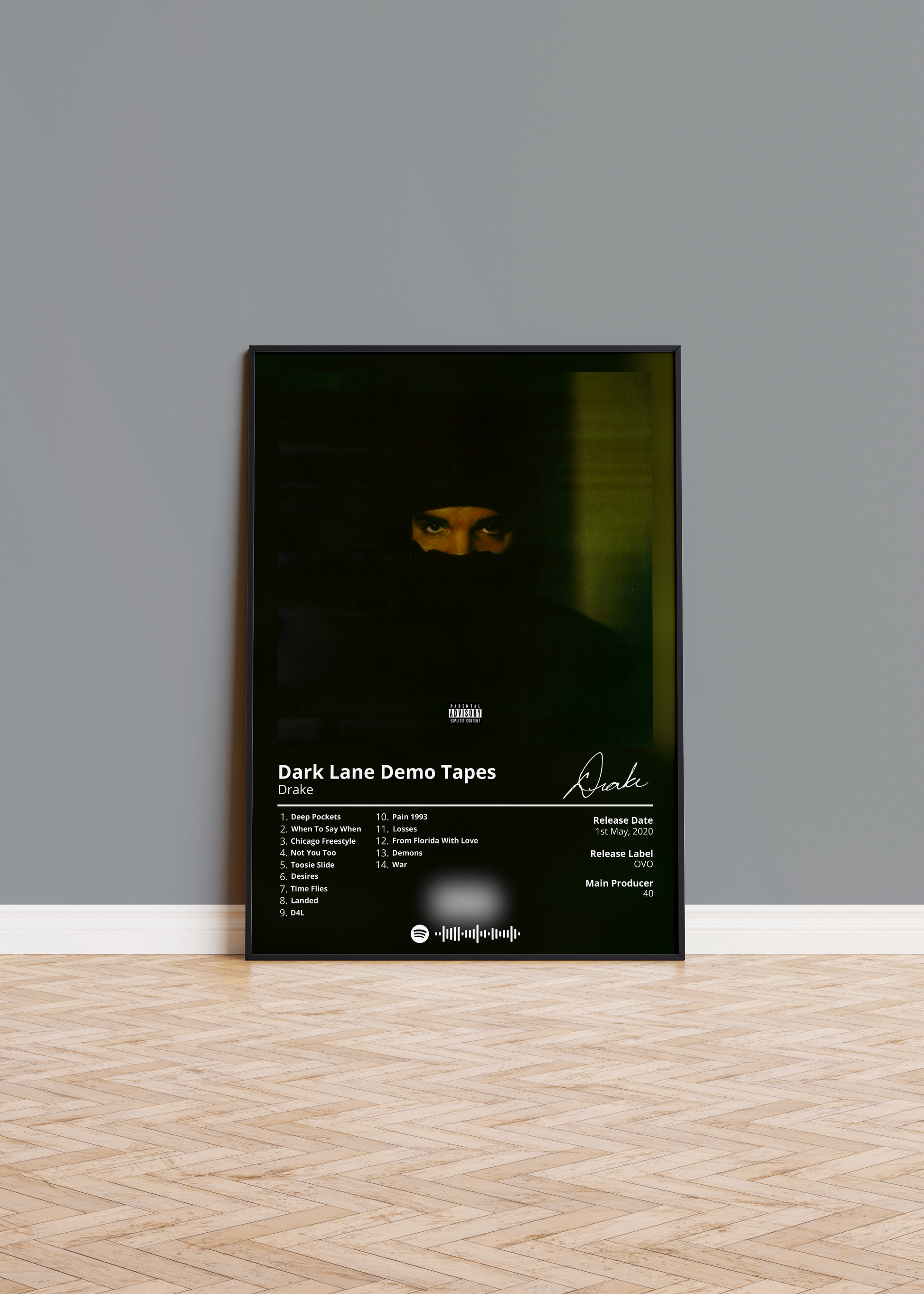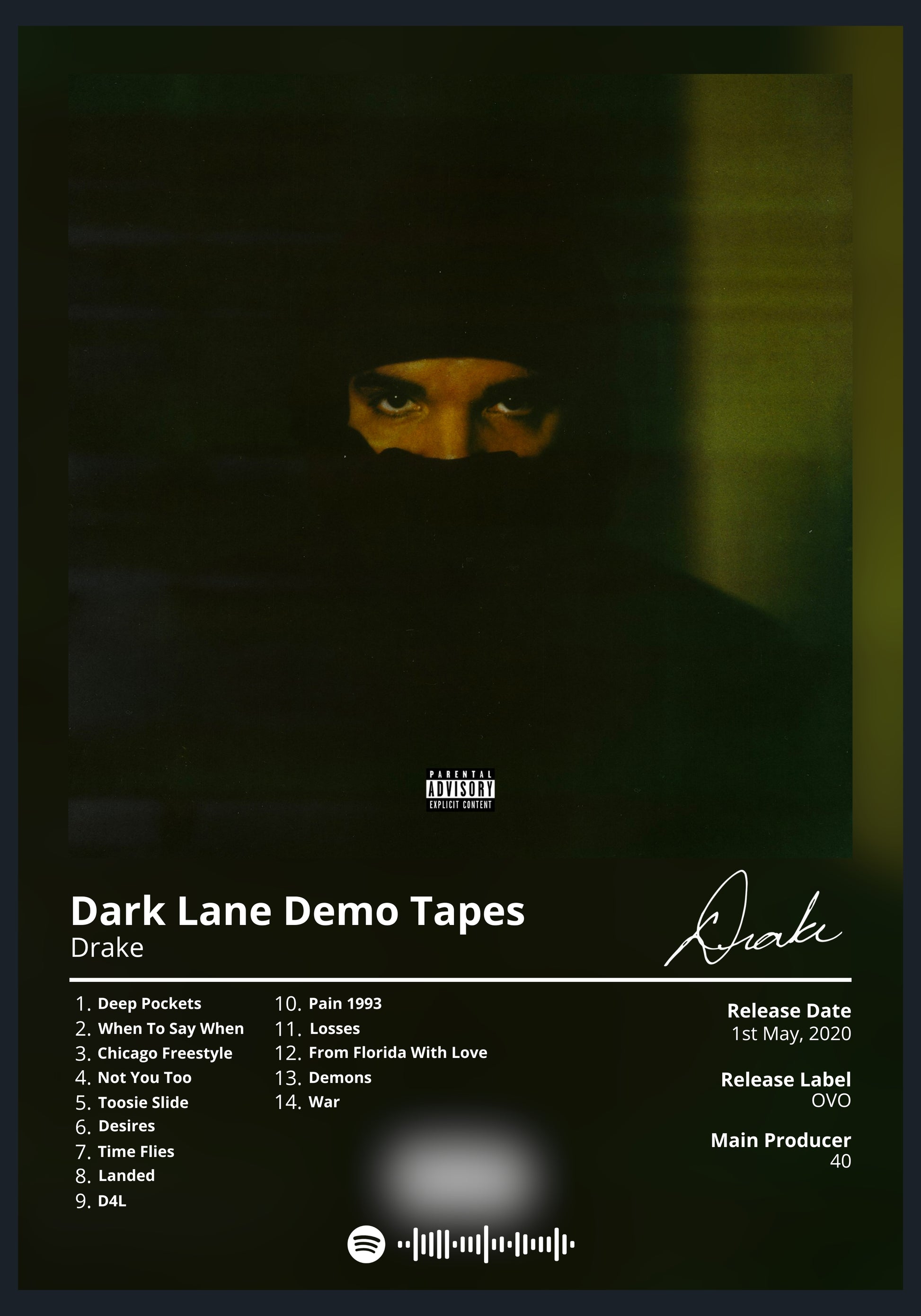 Drake's "Dark Lane Demo Tapes" is a must-have for any fan of the rapper's music. This poster features the album's cover art in a minimalist design that is perfect for any room.