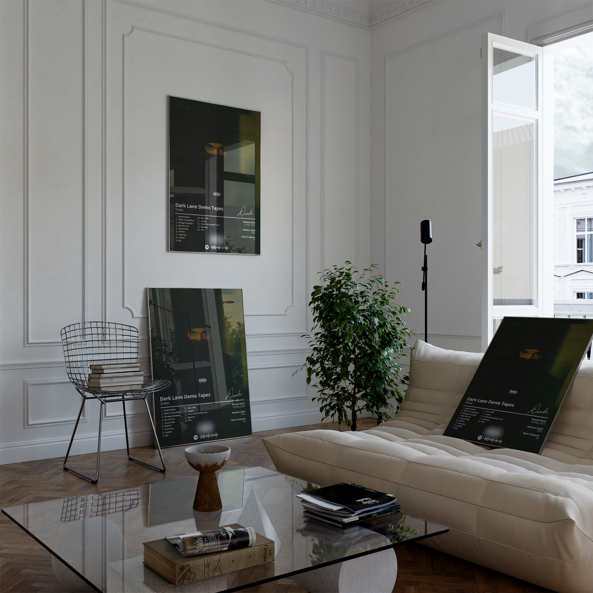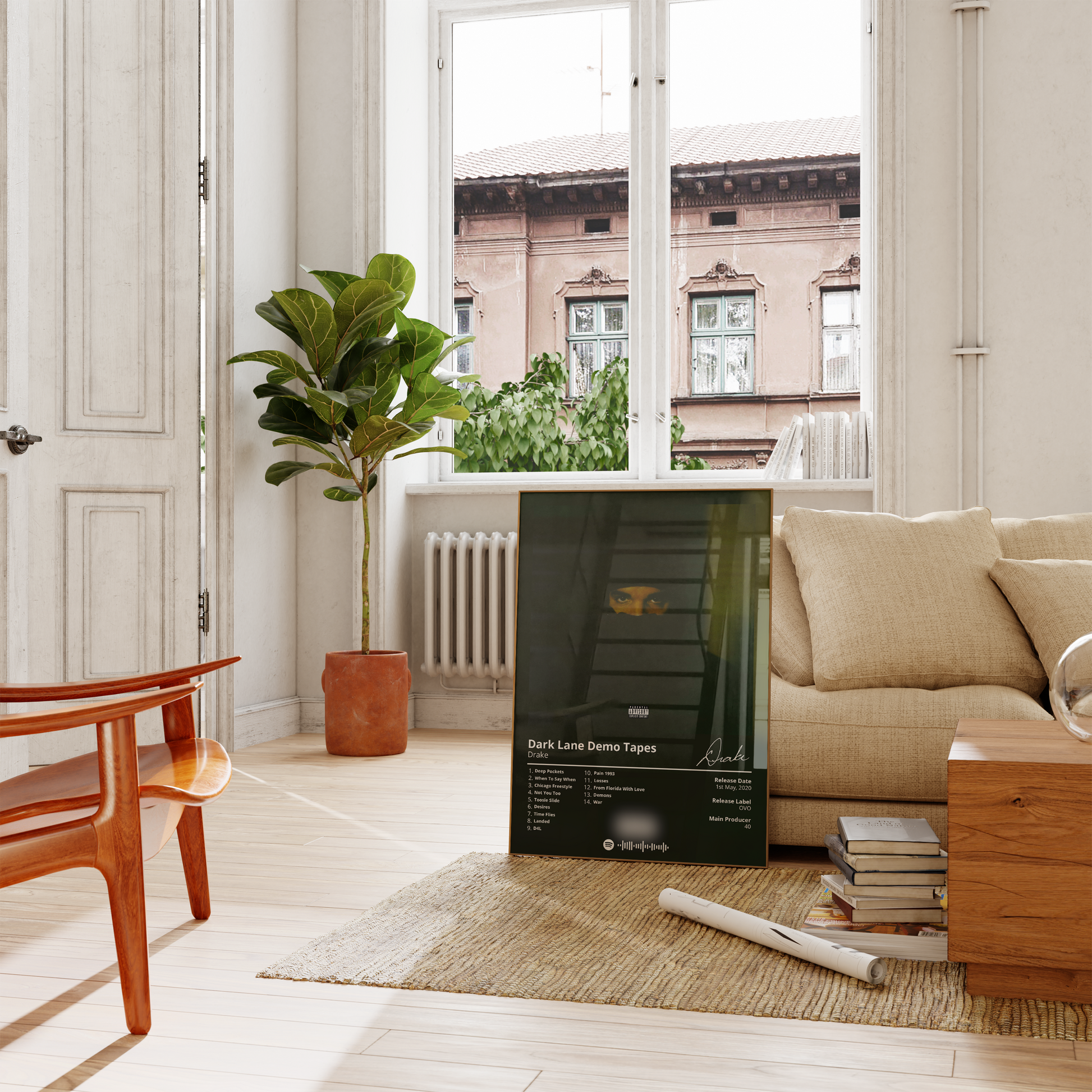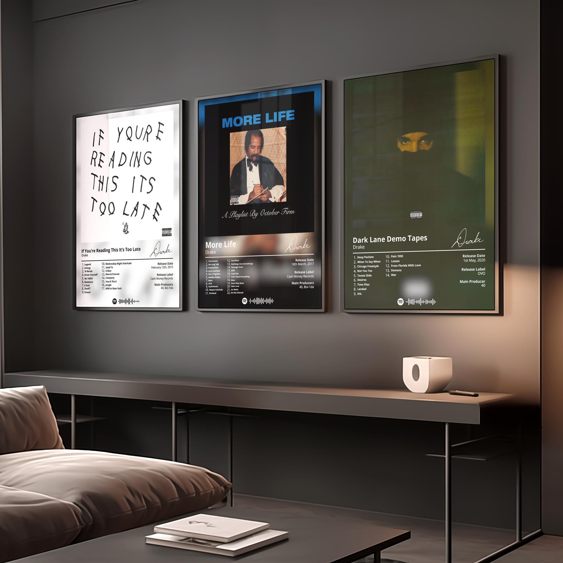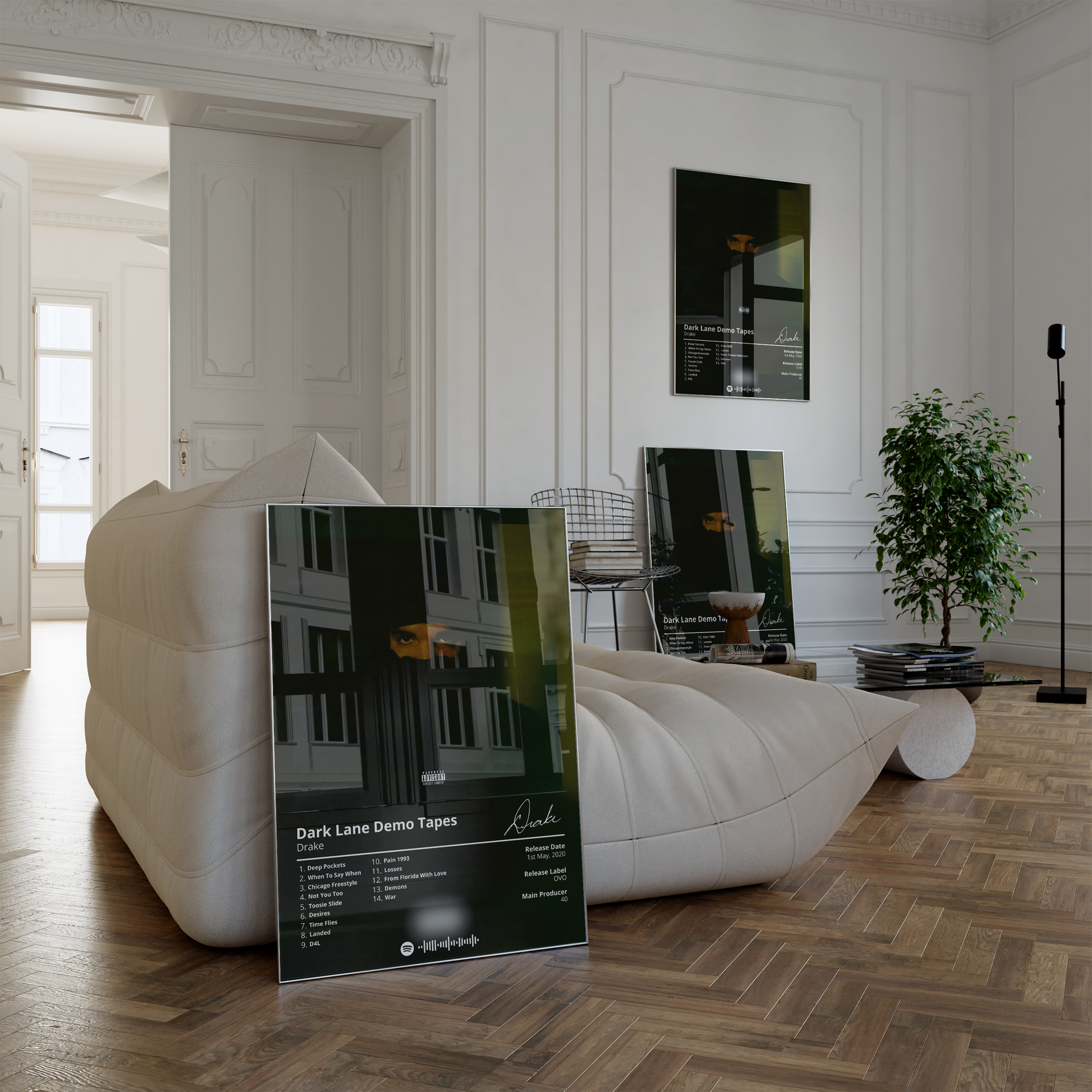 Drake's "Dark Lane Demo Tapes" is a must-have for any fan of the rapper's music. This poster features the album's cover art in a minimalist design that is perfect for any room.