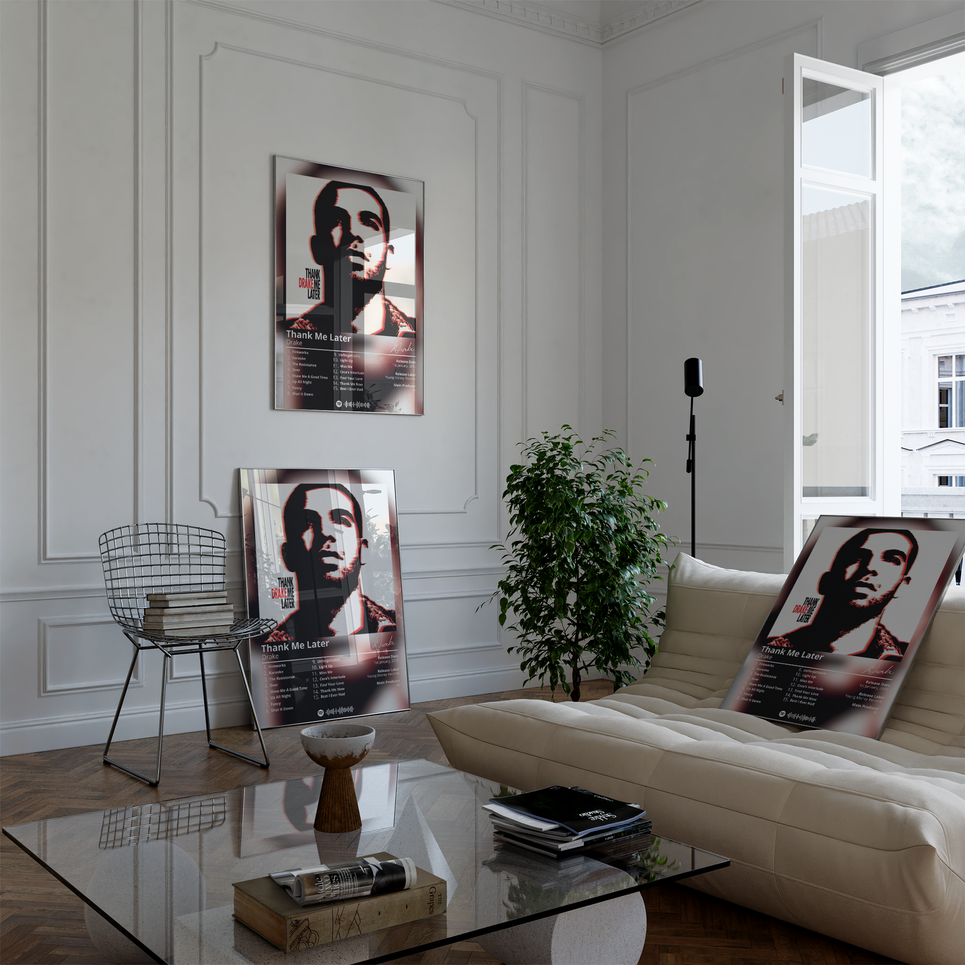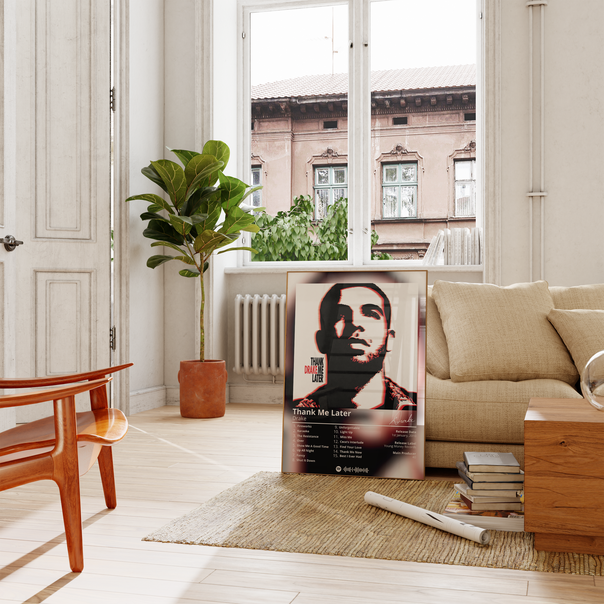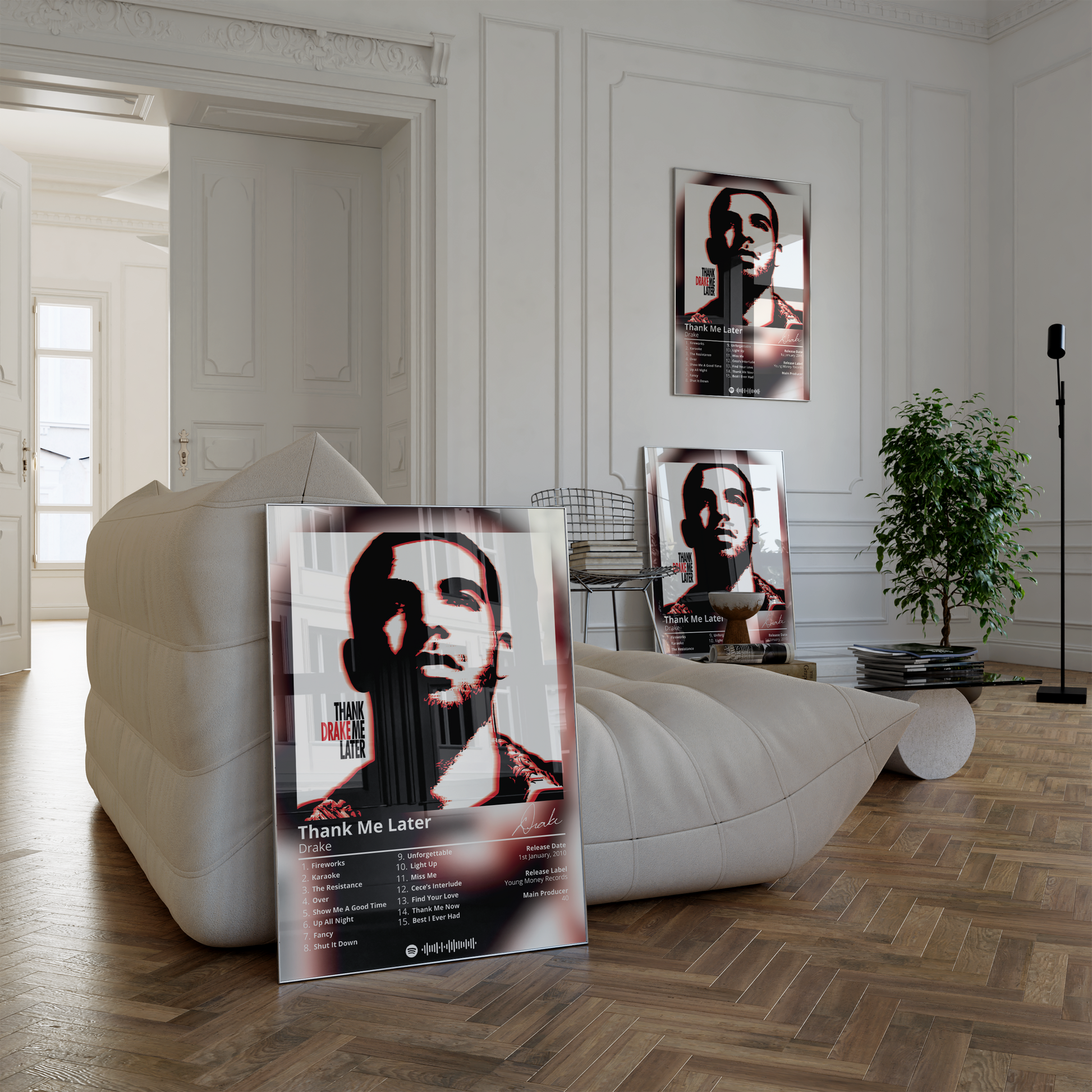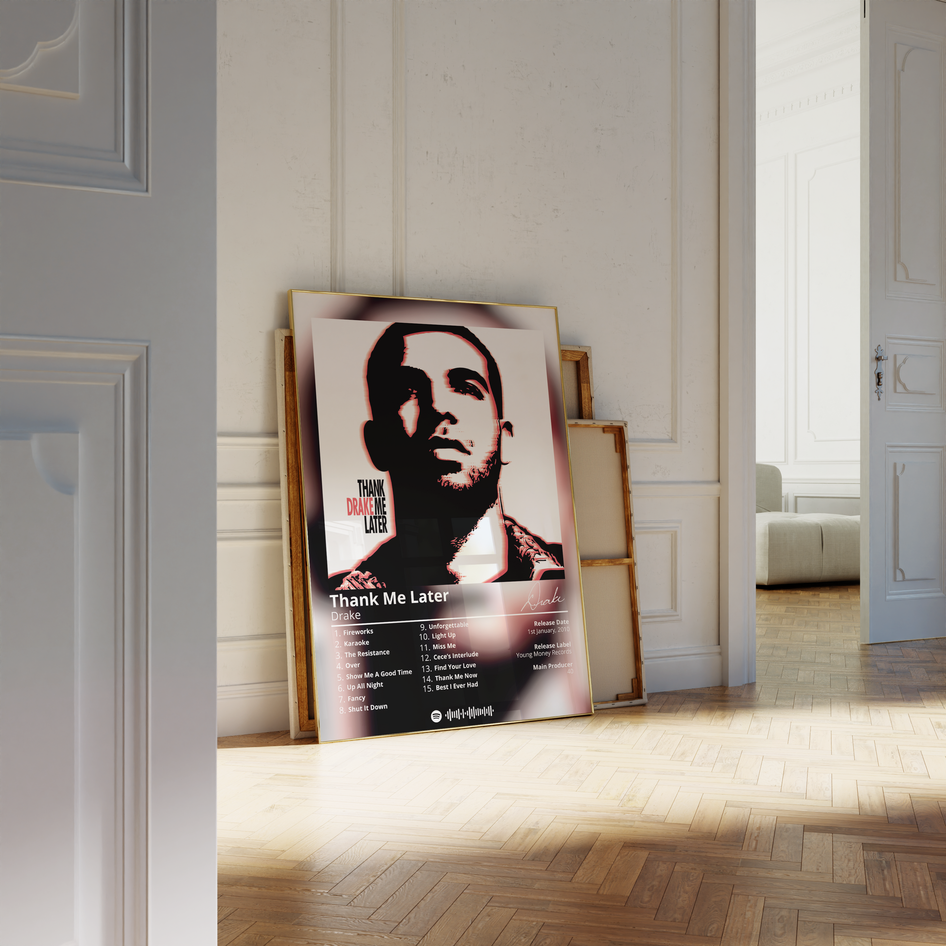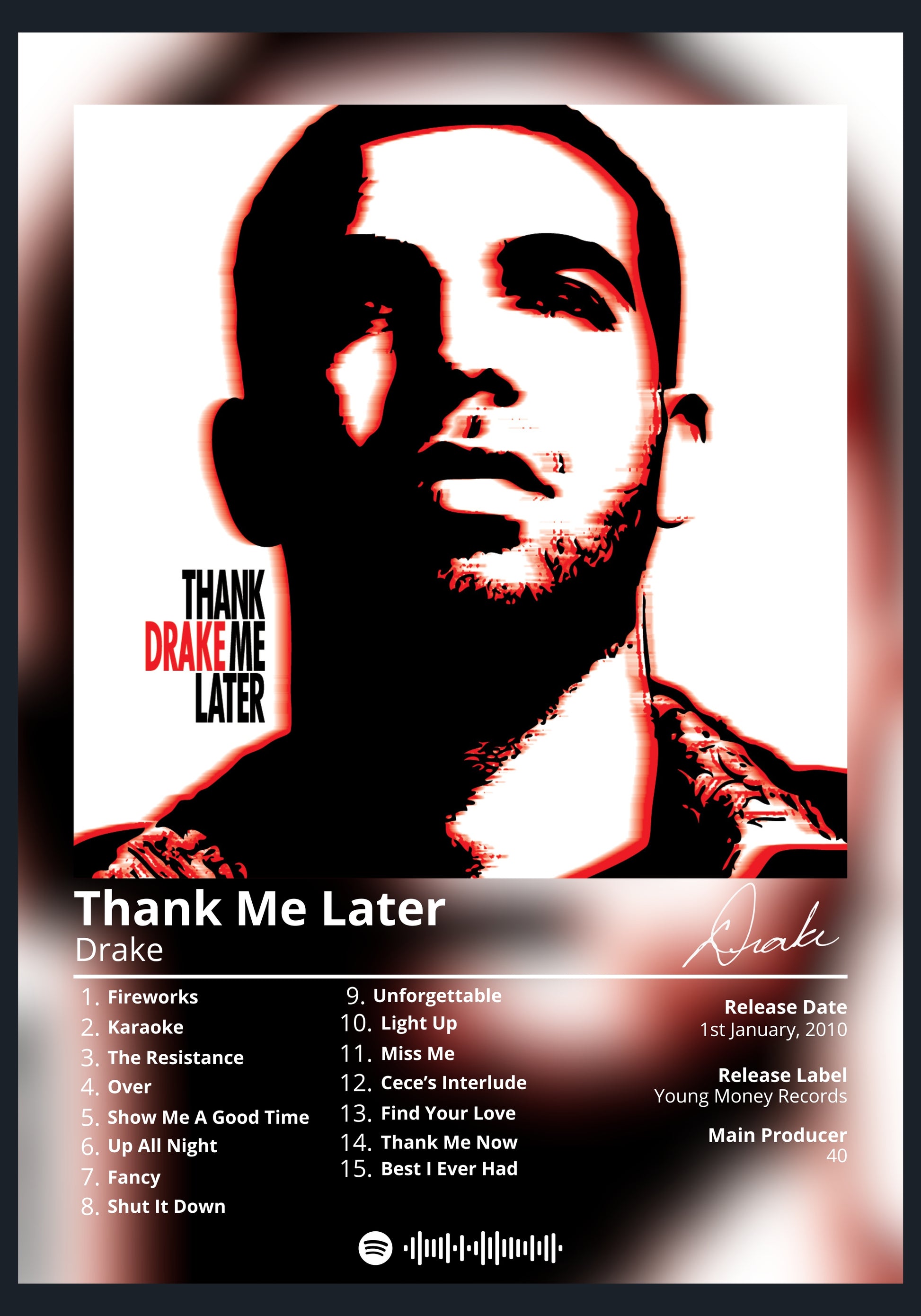 Drake's "Thank Me Later" is a must-have for any fan of the rapper's music. This poster features the album's cover art in a minimalist design that is perfect for any room.