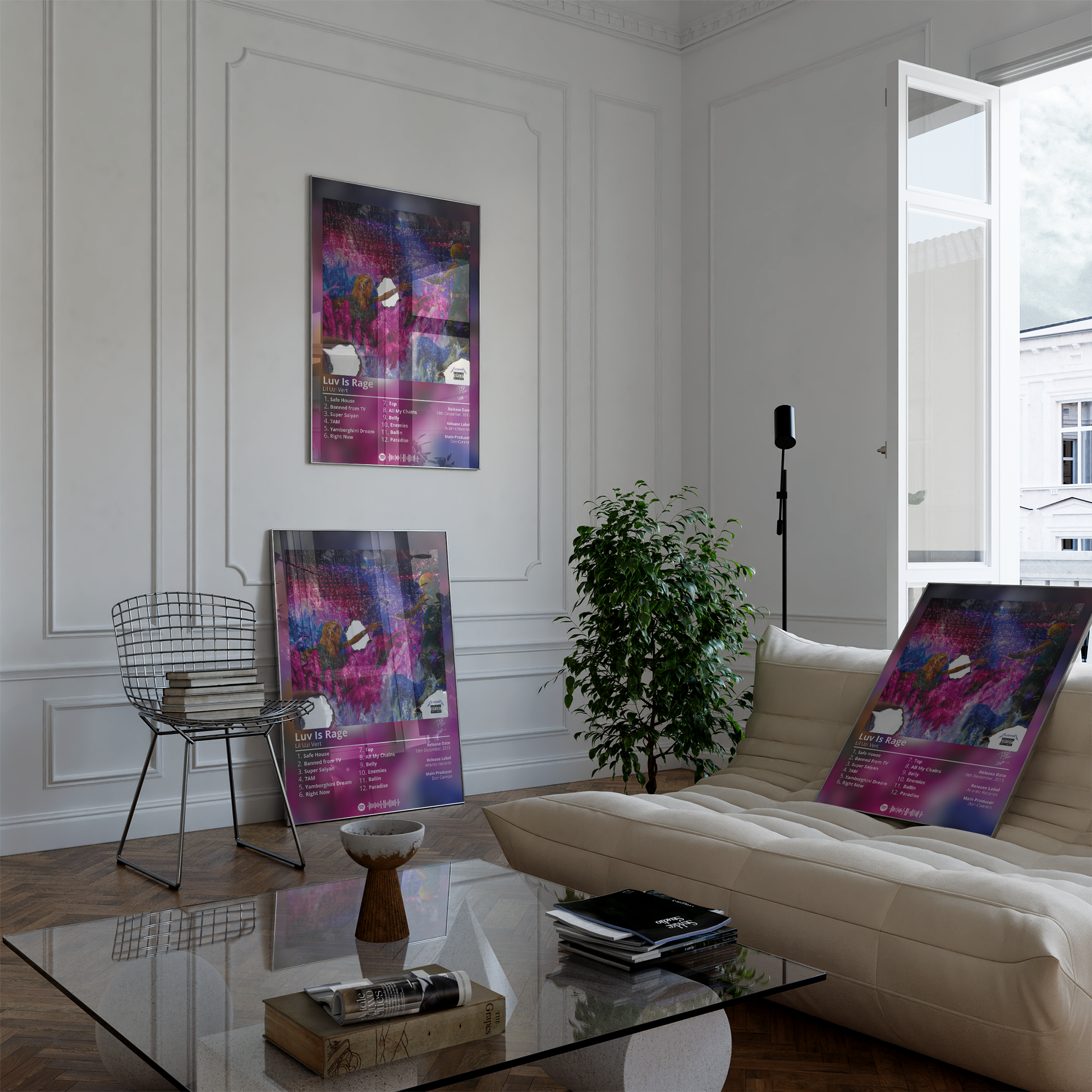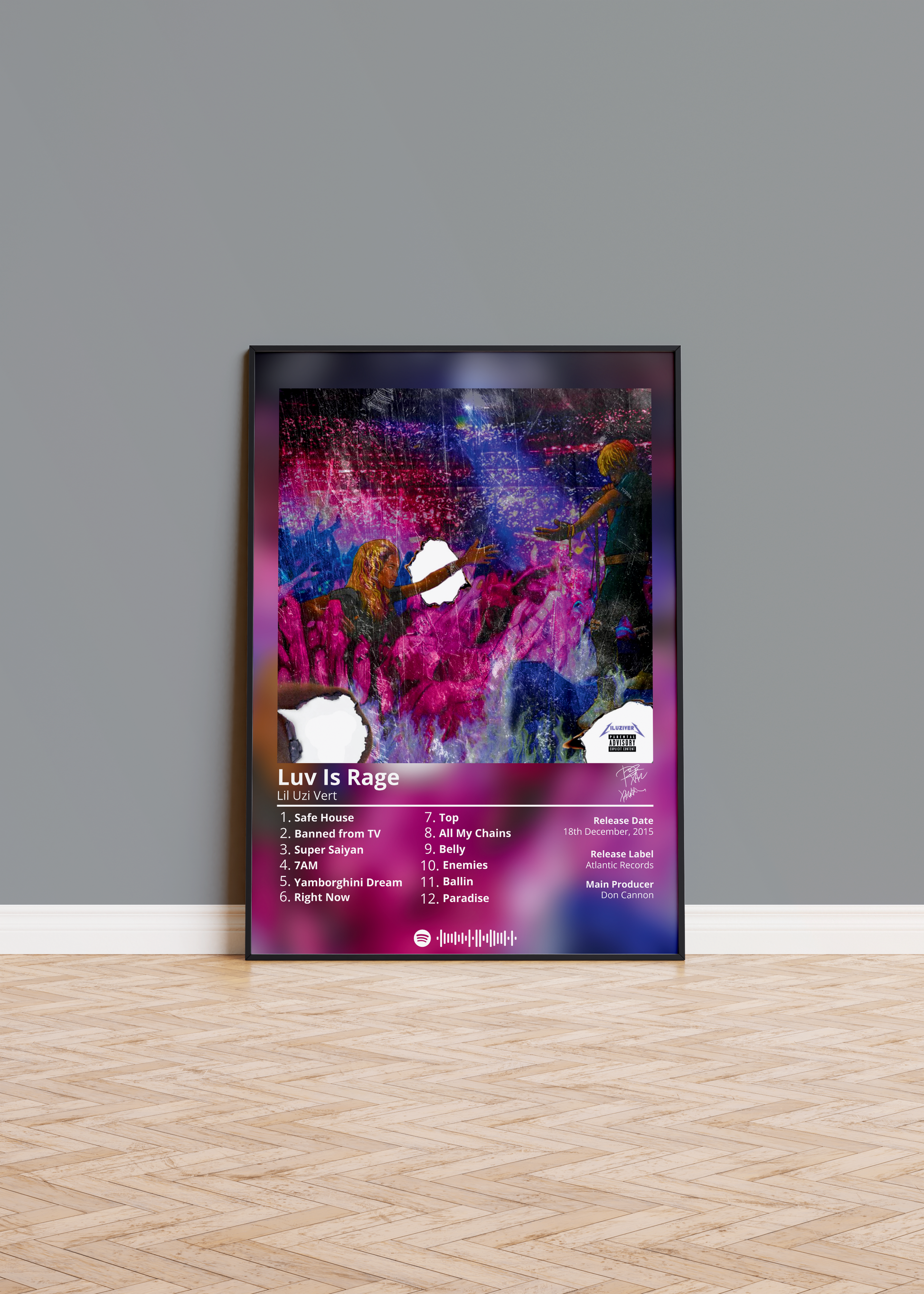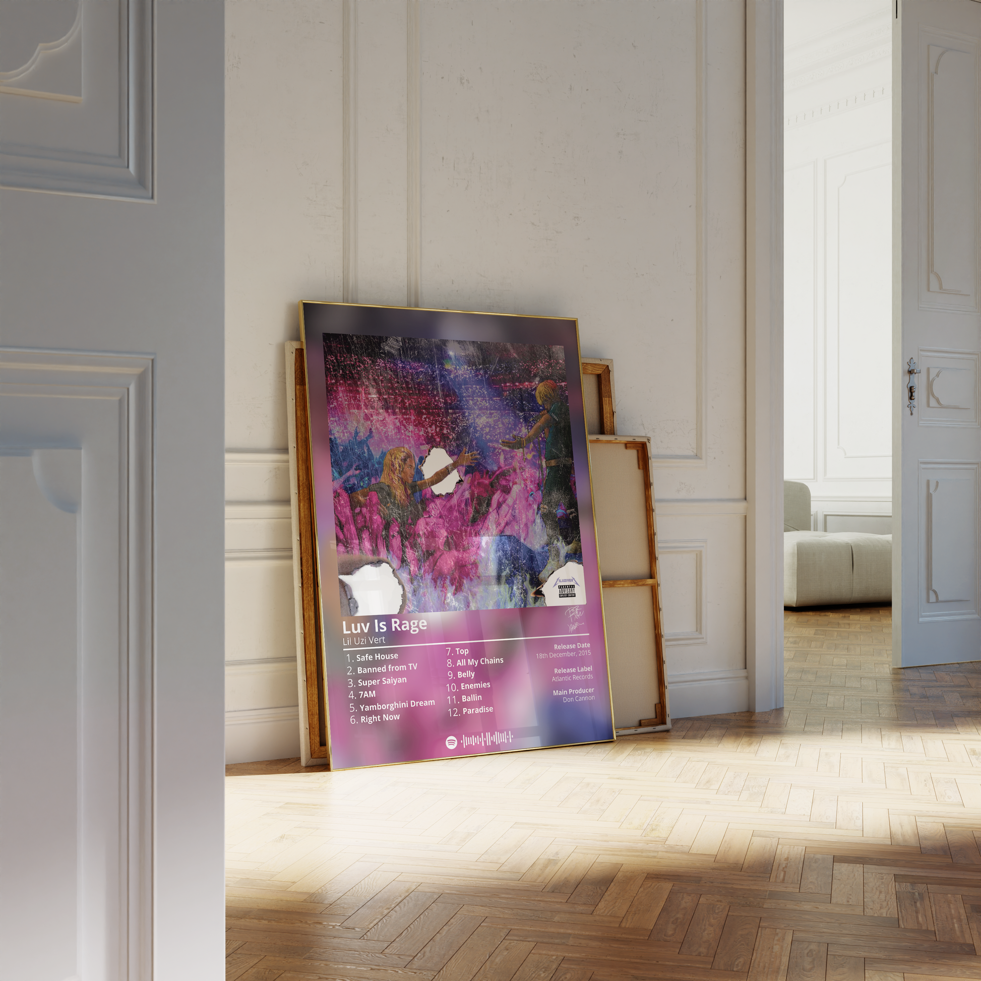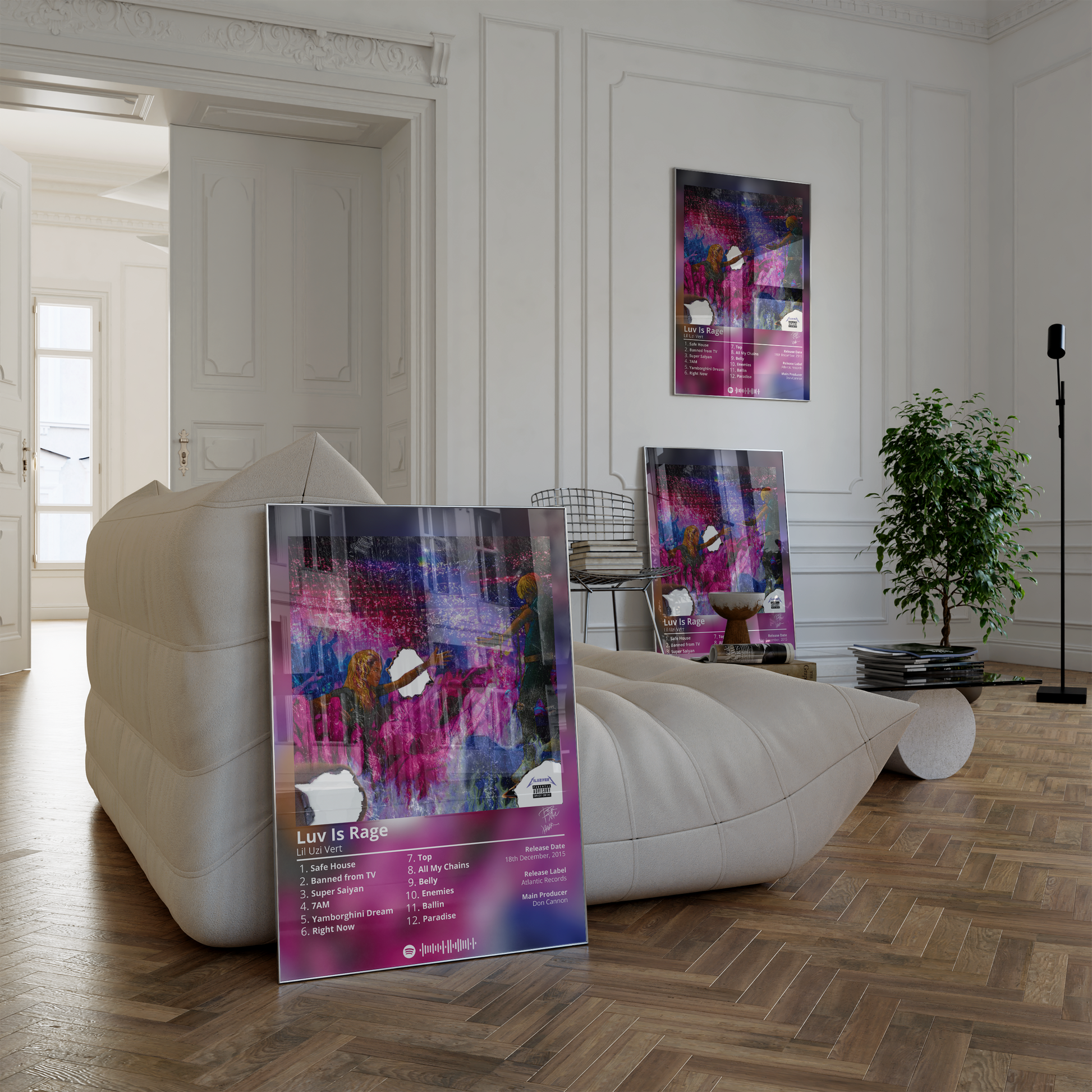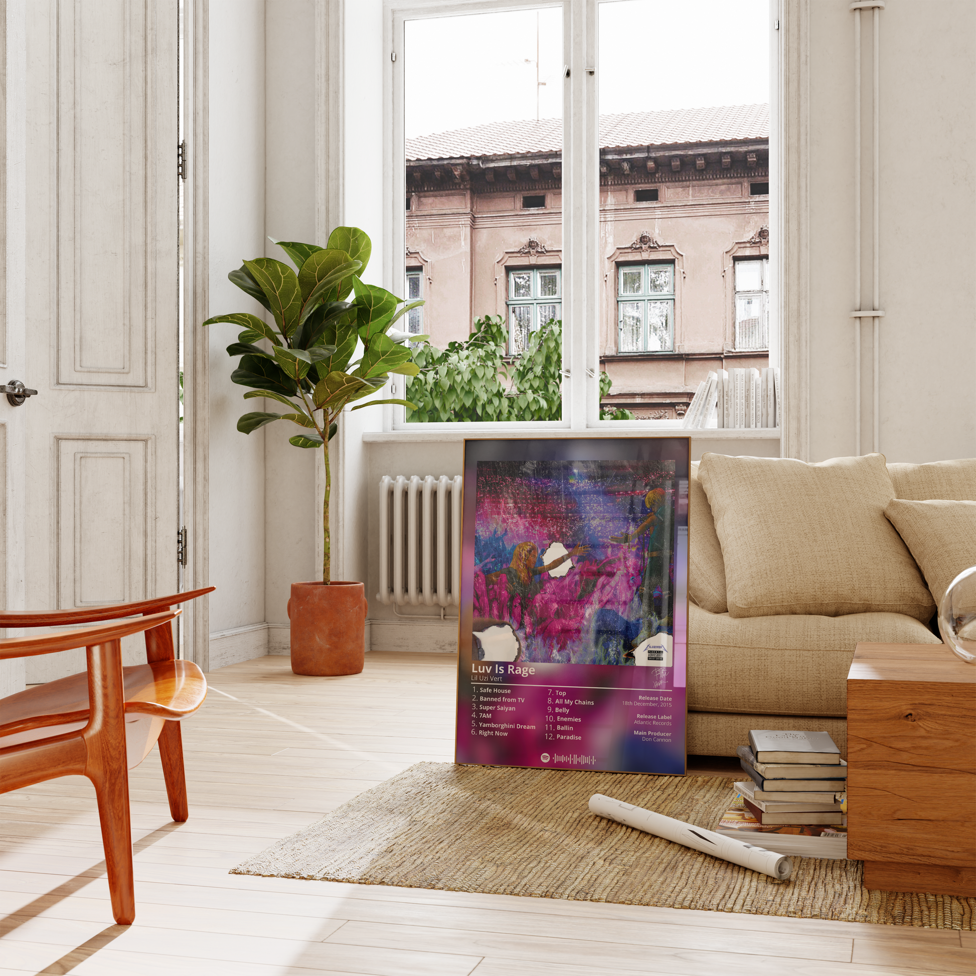 Lil Uzi Vert's "Luv Is Rage" is a must-have for any fan of the rapper's music. This poster features the album's cover art in a minimalist design that is perfect for any room.